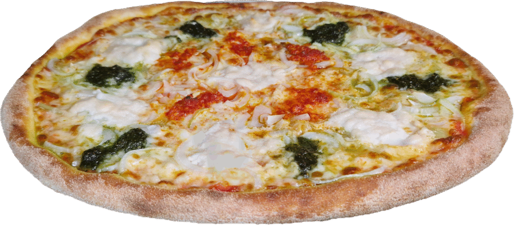 TOMATENSAUCE, PREMIUM MOZZARELLA, BIO ZWIEBELN, BIO KNOBLAUCH, PESTO, CHILISAUSSE, BIO OREGANO
