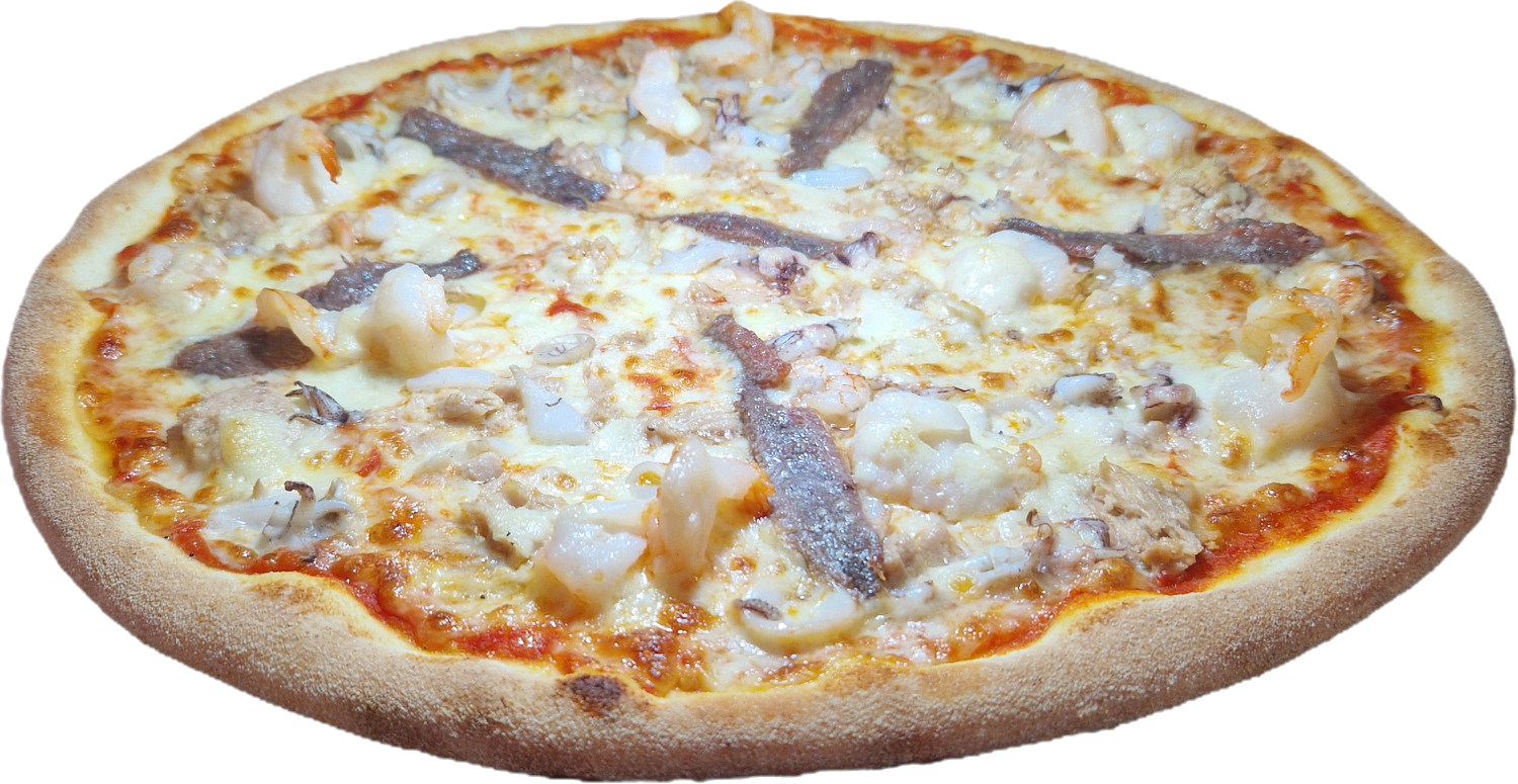 TOMATENSAUCE, PREMIUM MOZZARELLA (CH), RIESENCREVETTEN, THON, MEERESFRÜCHTE, SARDELLEN, GAMBERETTI, BIO KNOBLAUCH, BIO OREGANO